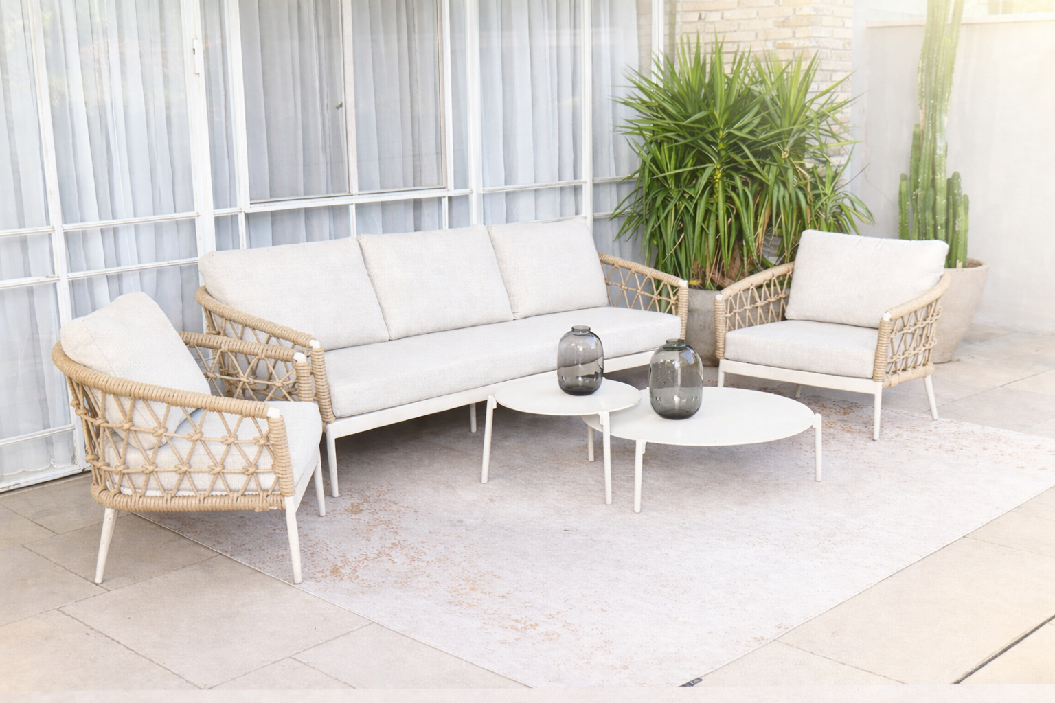 מיוז היא הדובדבן של מערכות הישיבה לגינה – עיצוב חבלים טבעי שמעניק מראה עדין ויוקרתי, גימורים משובחים, לצד ריפוד נעים באיכות בלתי מתפשרת. עם ספה תלת-מושבית, שתי כורסאות יחיד ו-2 שולחנות קפה, גדול וקטן. אנחנו בטוחים שהיא תהפוך לפינת הישיבה המועדפת על בני המשפחה והחברים.