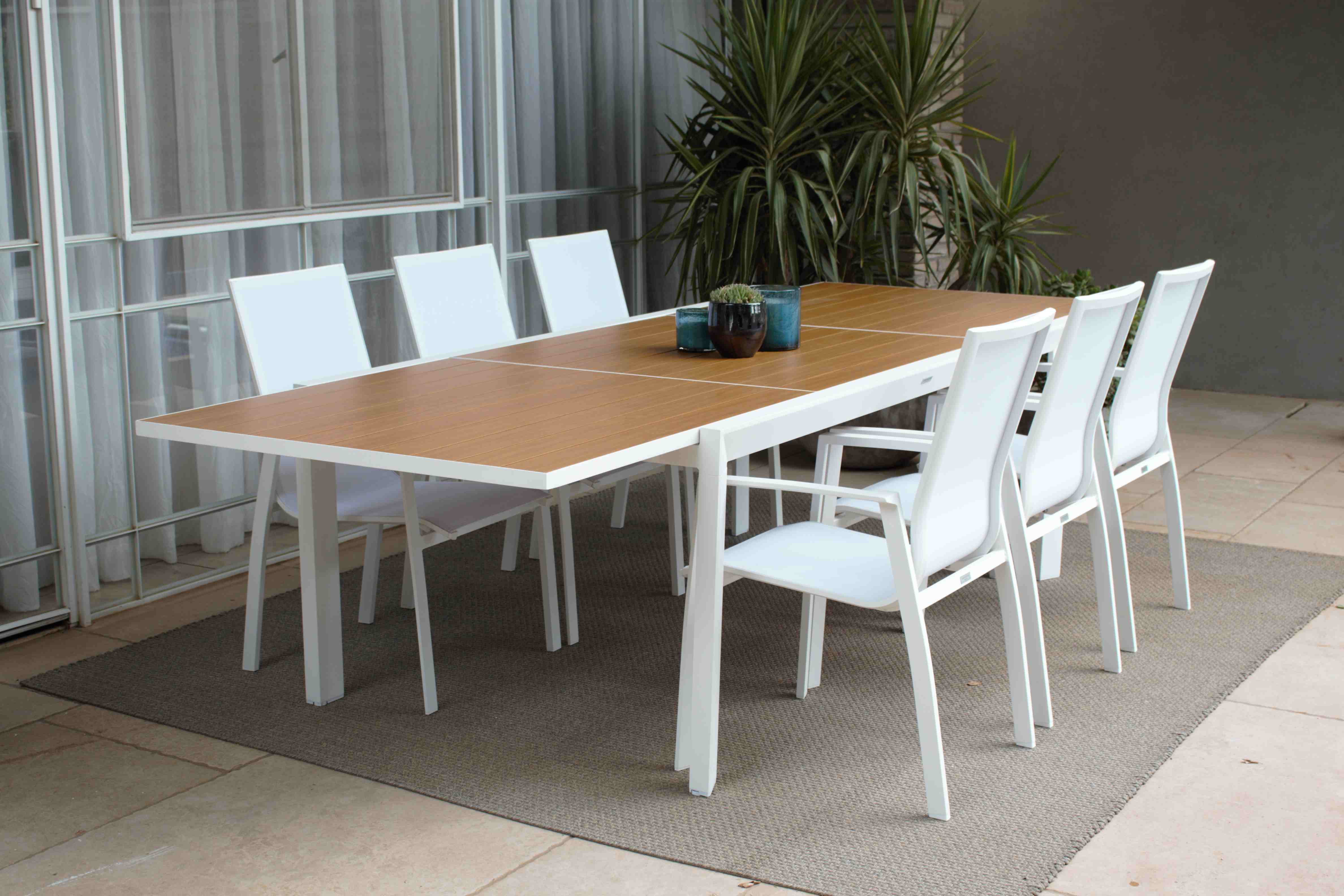 פינת אוכל חוץ יוקרתית עם שולחן נפתח מ-200X110ס"מ ל300 ס"מ, עשוי שלדת אלומיניום ופלטת אלומיניום במראה דמוי עץ טבעי. כוללת 6 כיסאות דגם ווילי , עשויים אלומיניום עמיד לתנאי חוץ. פתרון מושלם לאירוח מרשים ושדרוג כל מרפסת או גינה!