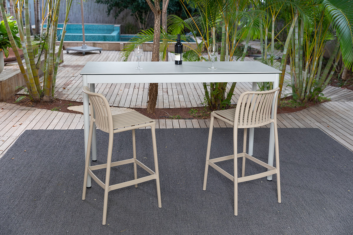 שולחן בר איכותי ועמיד לחוץ, משולב שלדת אלומיניום חזקה ופלטת שיש יוקרתית. מתאים לגינה, מרפסת וחללי אירוח.