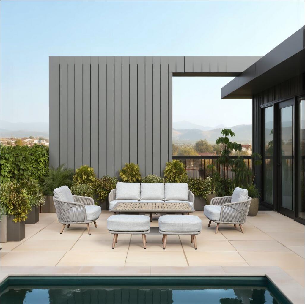מוד מערכת ישיבה יוקרתית לחוץ סט שמשלב נוחות של סלון עם פונקציונליות של שולחן אוכל .