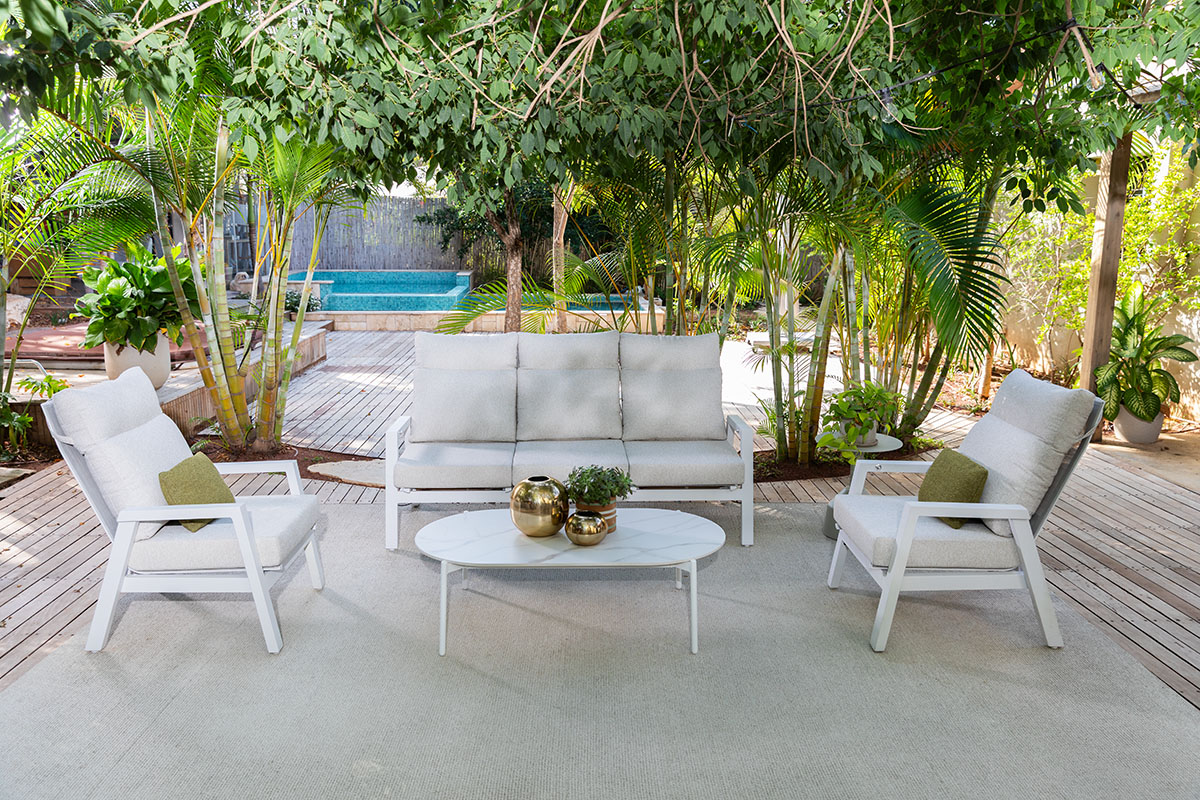 מערכת ישיבה אלגנטית ומפנקת בעיצוב מודרני ונקי. השלדה עשויה אלומיניום איכותי בצבע פשתן או לבן עמידה לחלודה ולפגעי מזג האוויר. הכריות העבות מרופדות בבד נעים ועמיד לשמש ולחות, ומספקות נוחות מירבית.